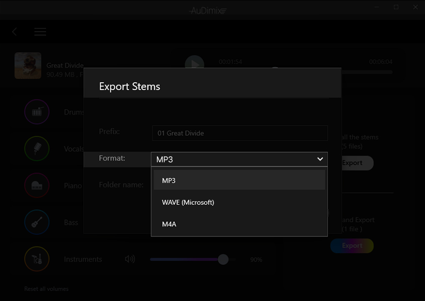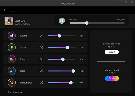 Esta capacidade dá a liberdade a músicos, DJs e produtores de criarem bases para misturas a seu gosto, que podem ser geradas com pouquíssimos cliques. Tudo o que é necessário é importar a faixa a alterar para a AuDimix, ajustar os níveis de cada parâmetro a gosto, e exportar o resultado ou resultados finais. Os formatos de ficheiros compatíveis são variados, e albergam MP3, WAV, FLAC, M4A, AAC e WMA, ou seja, podes optar por extrair áudio de qualidade elevada e sem perdas, ou então um ficheiro menor e mais compactado.