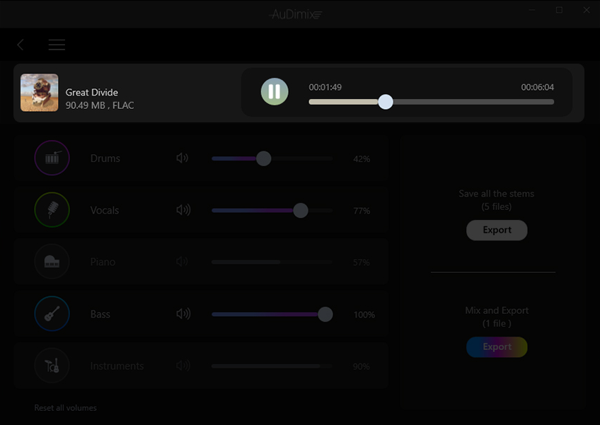 A AuDimix é uma aplicação exclusiva para Windows que permite separar os diferentes instrumentos e vozes de uma faixa sonora. Para isso acontecer, a AuDimix permite ajustar o volume (ou cortá-lo) de cada um dos elementos individualmente, e de seguida exportar o resultado final personalizado. Os parâmetros em que é possível mexer são os seguintes: