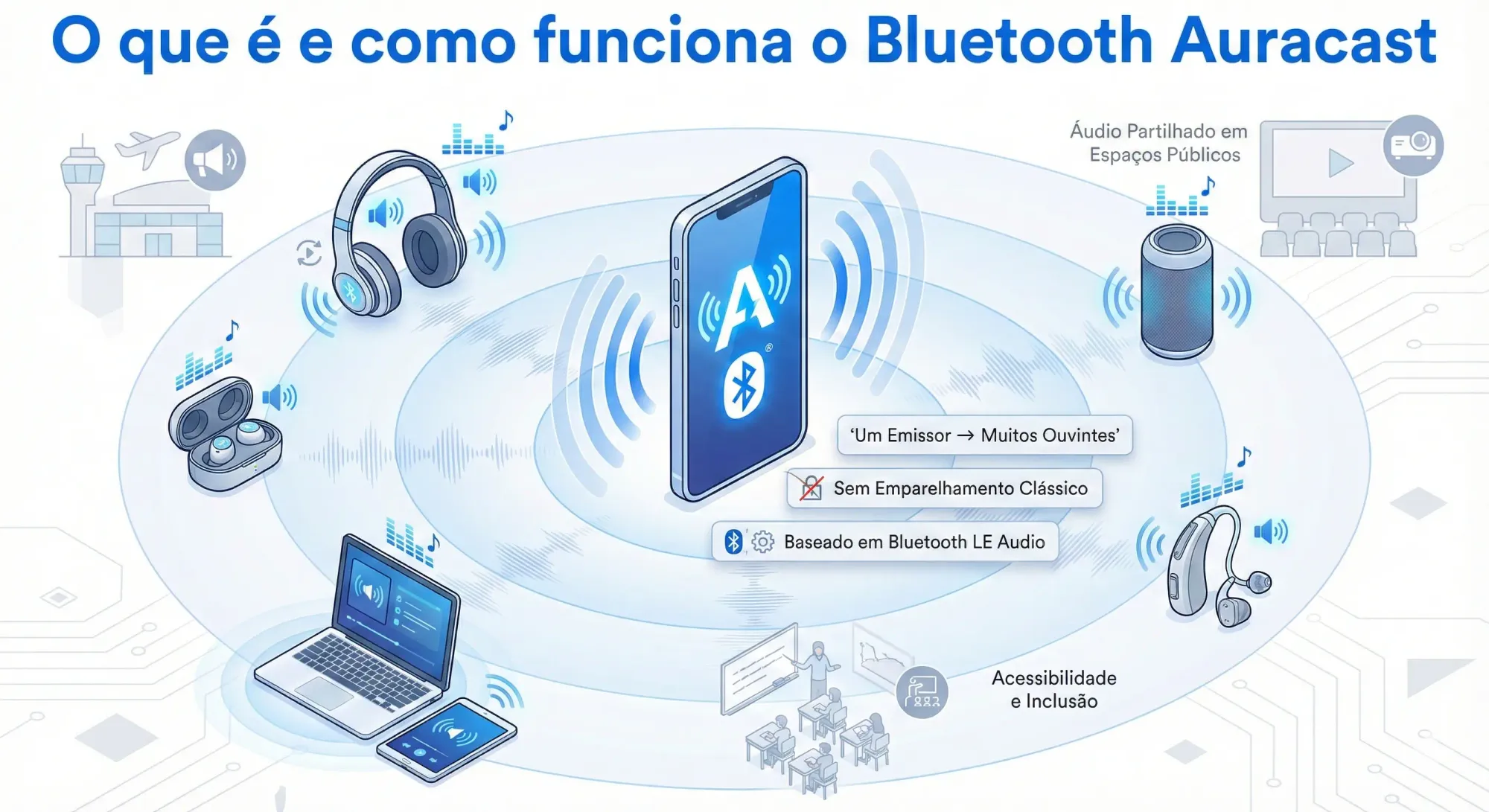 Bluetooth Auracast é uma tecnologia de transmissão de áudio que permite a partilha de som de um para múltiplos dispositivos simultaneamente, sem necessidade de emparelhamento direto. Mas como funciona esta tecnologia de partilha de áudio sem fios?