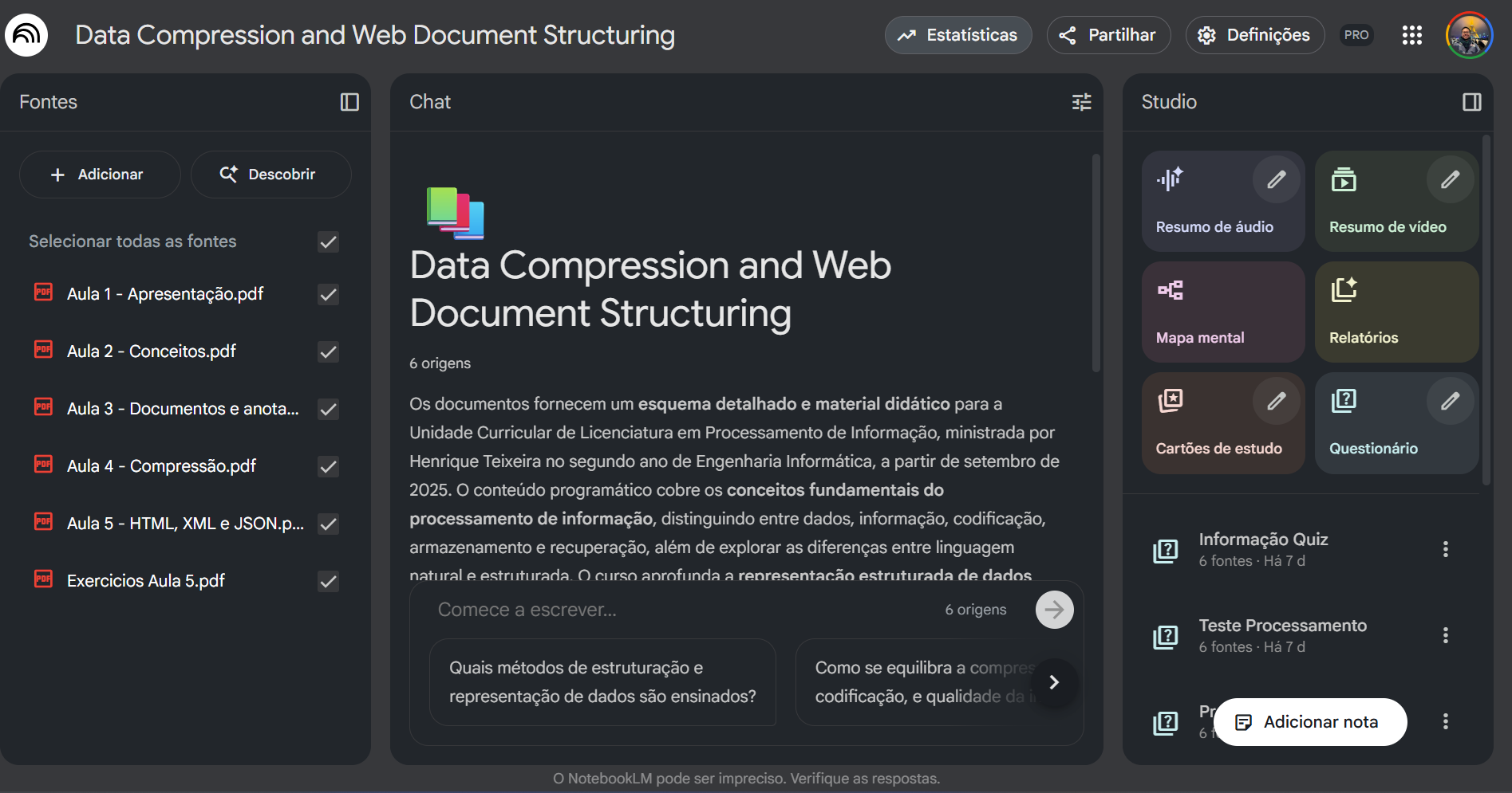 Uma vez criada a conta, que pode ser com um plano gratuito ou pago, podemos criar o nosso projeto. Após inserirmos o material fonte, o Notebook dará logo um resumo, sendo que é a partir daqui que podemos começar a questionar o nosso Notebook. Mas, caso não queiram questionar, o mesmo tem a aba Studio. É aqui que a magia acontece e, consegue mesmo, ser… mágica.