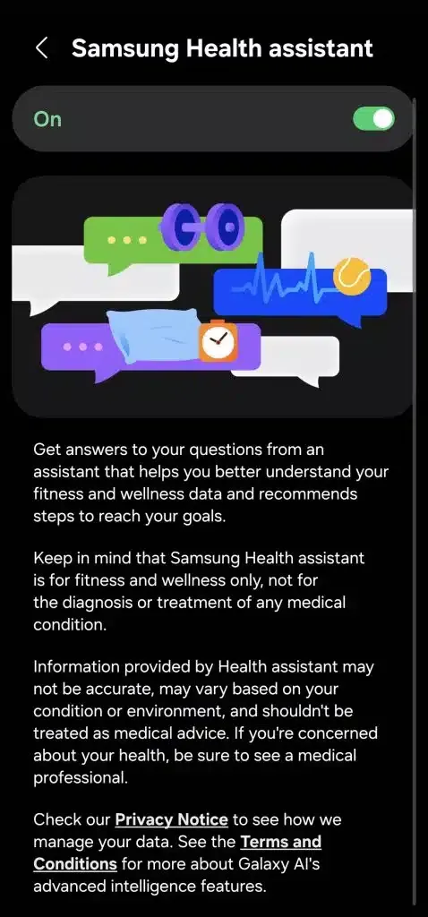 Por último, e após a empresa ter dado pistas desta integração nos Unpacked deste ano, o Samsung Health terá um coach que, ao aceder aos diversos dados de saúde da aplicação, poderá dar dicas e explicações a respeito dos mesmos:
