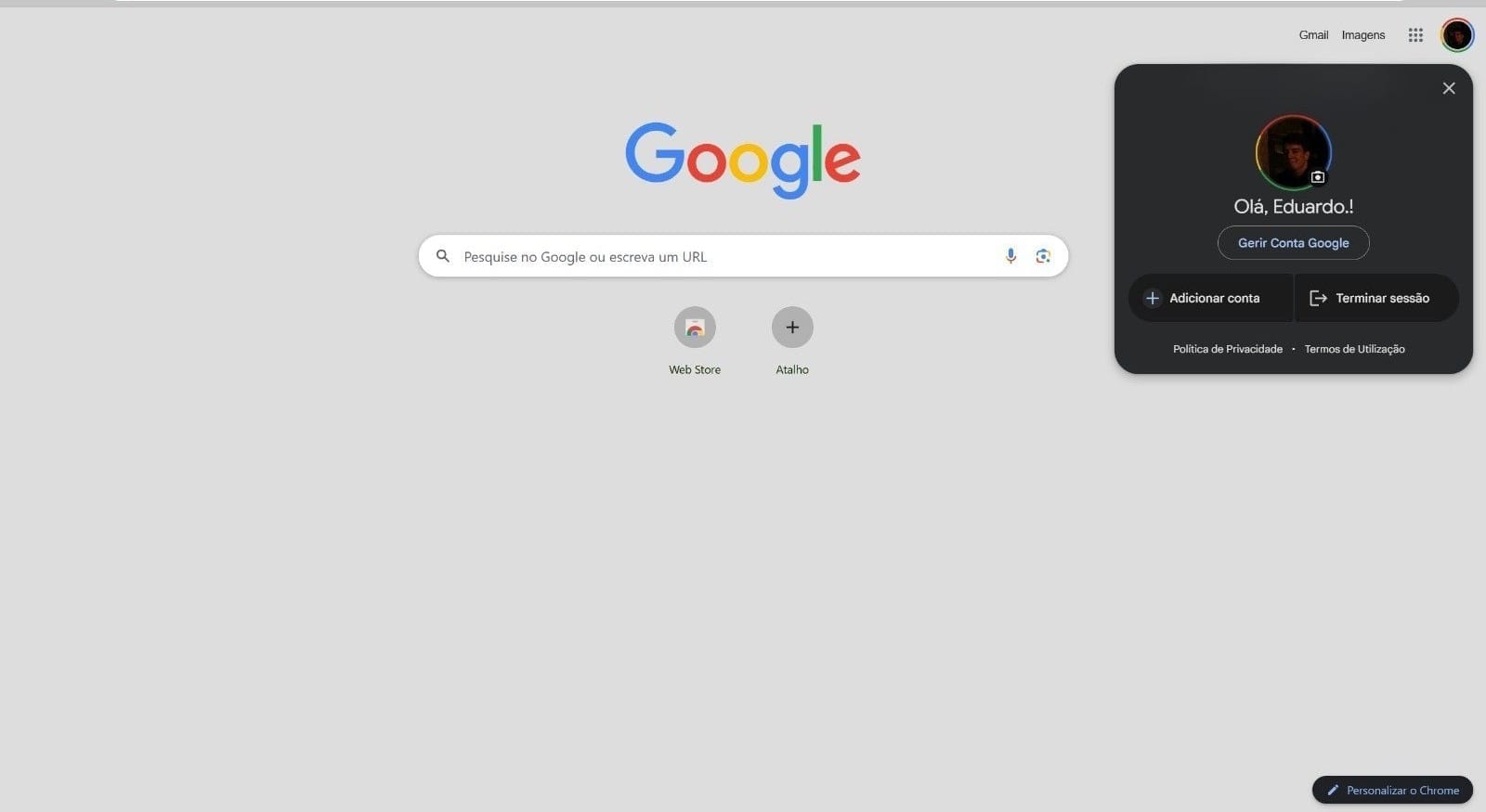 Abrindo o nosso browser e já com a nossa conta Google associada ao mesmo, basta aceder a google.com e, no canto superior direito, encontramos novamente o ícone da nossa conta, que uma vez selecionado abre uma pequena janela onde podemos selecionar "Gerir Conta Google".
