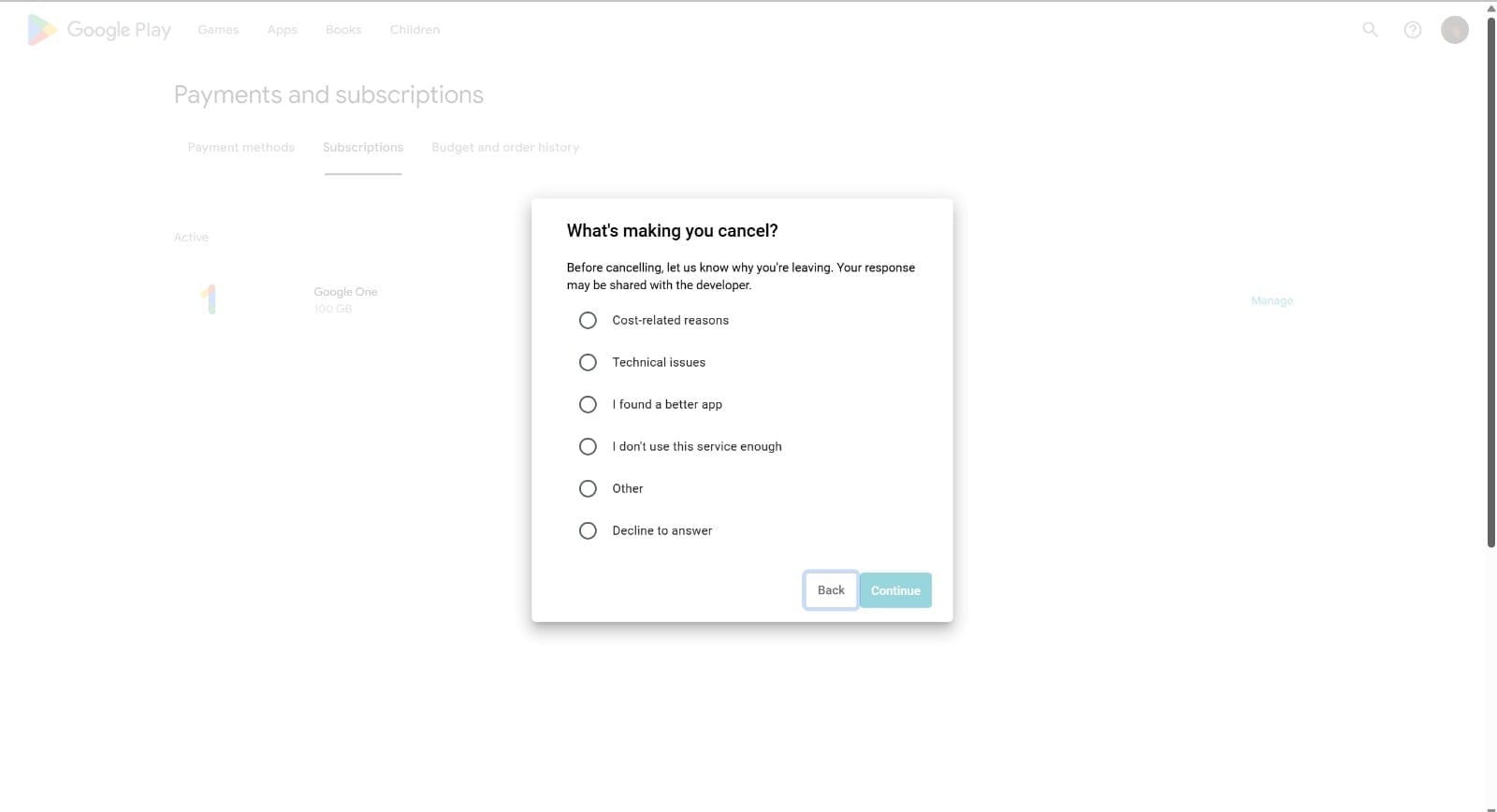 Cancelamento através da aplicação da Play Store