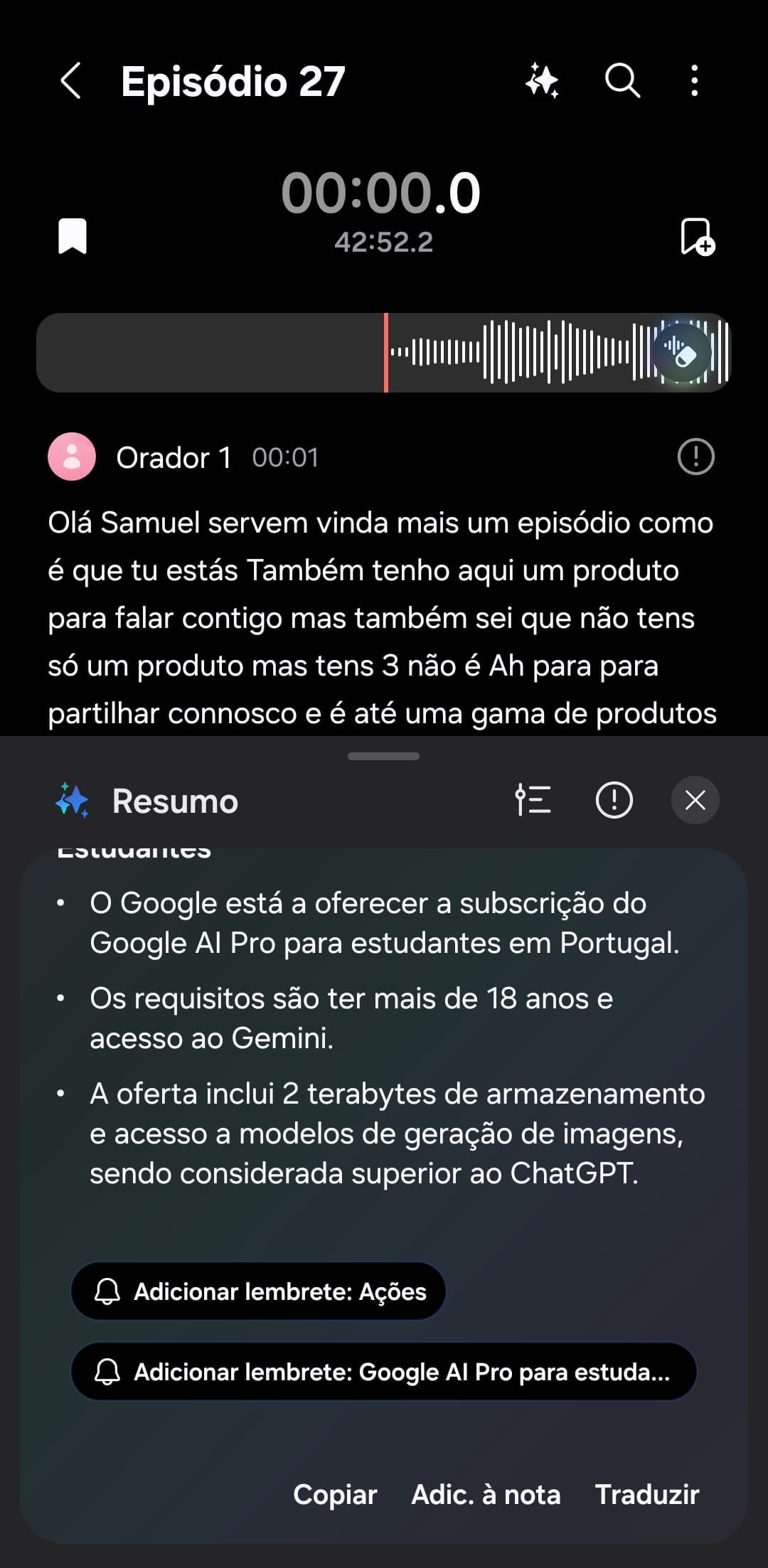 Com base no que já existe na One UI 8, as ferramentas de IA abrangem várias áreas do sistema. Nas chamadas, podemos gravar, traduzir e até gerar um resumo automático, enquanto na escrita surgem melhorias visíveis em qualquer aplicação ou campo de texto, acompanhadas de um Intérprete capaz de traduzir em tempo real — algo que lembra o que a Google chegou a fazer com o seu Tradutor. Na vertente produtiva, a Galaxy AI integra-se nas aplicações Notas e Gravador: é possível resumir conteúdos, formatar texto, transcrever áudio e até gerar capas personalizadas para os blocos de notas. Essa lógica estende-se ao Gravador, que passa a transcrever automaticamente as nossas gravações. O mais impressionante? Como a suite da Samsung suporta vários idiomas, muitas destas funcionalidades, como as transcrições, funcionam offline e com uma rapidez surpreendente.