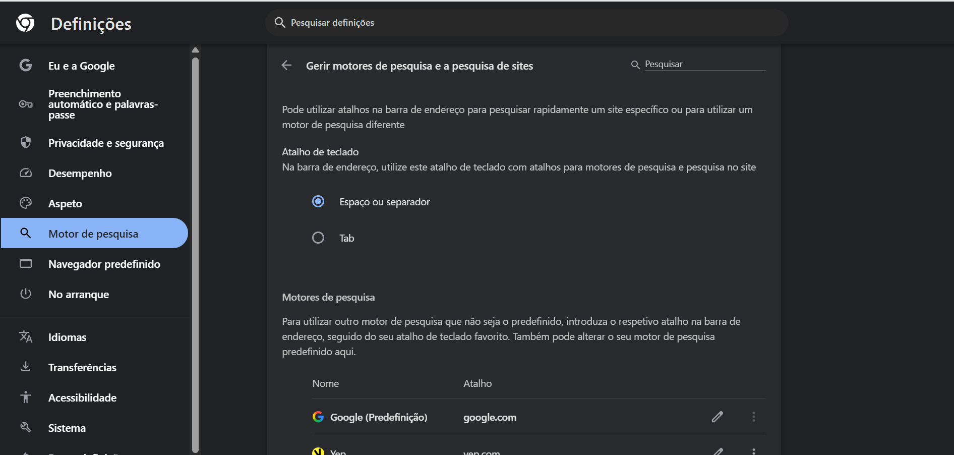 Aqui o ideal é usarmos o Google Chrome, onde ao inserirmos o url "chrome://settings/searchEngines", somos redirecionados para as definições do browser: