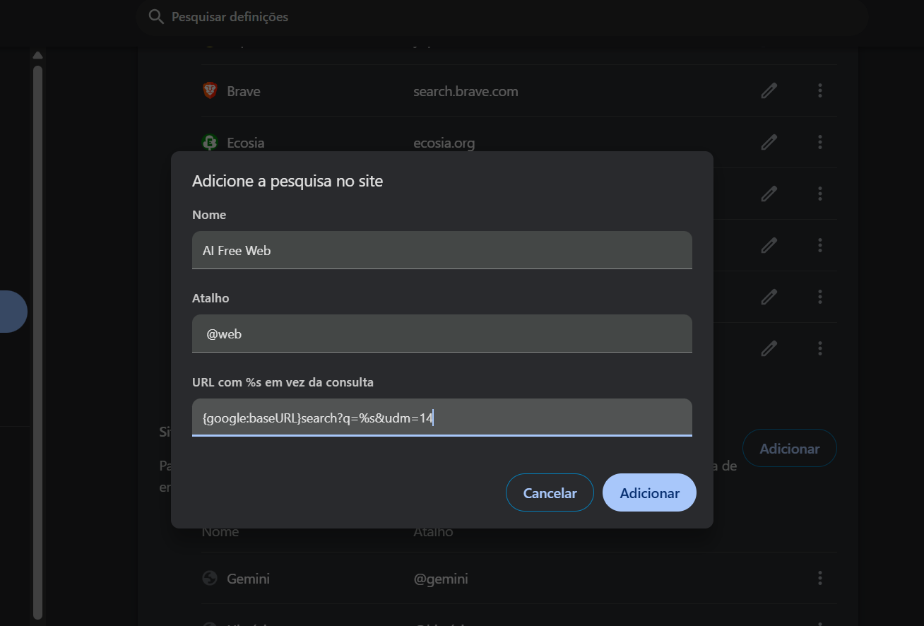 Com esta adição, esta nova fonte de pesquisa irá aparecer e basta predefinir a mesma. Isto permite enganar a Google, o que fará com que não apareça mais nada relacionado com a Vista AI ao se procurar diretamente na caixa de pesquisa do browser.