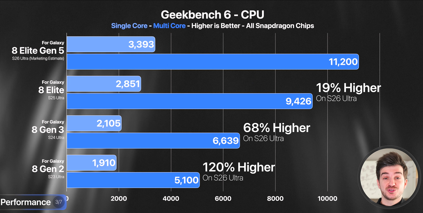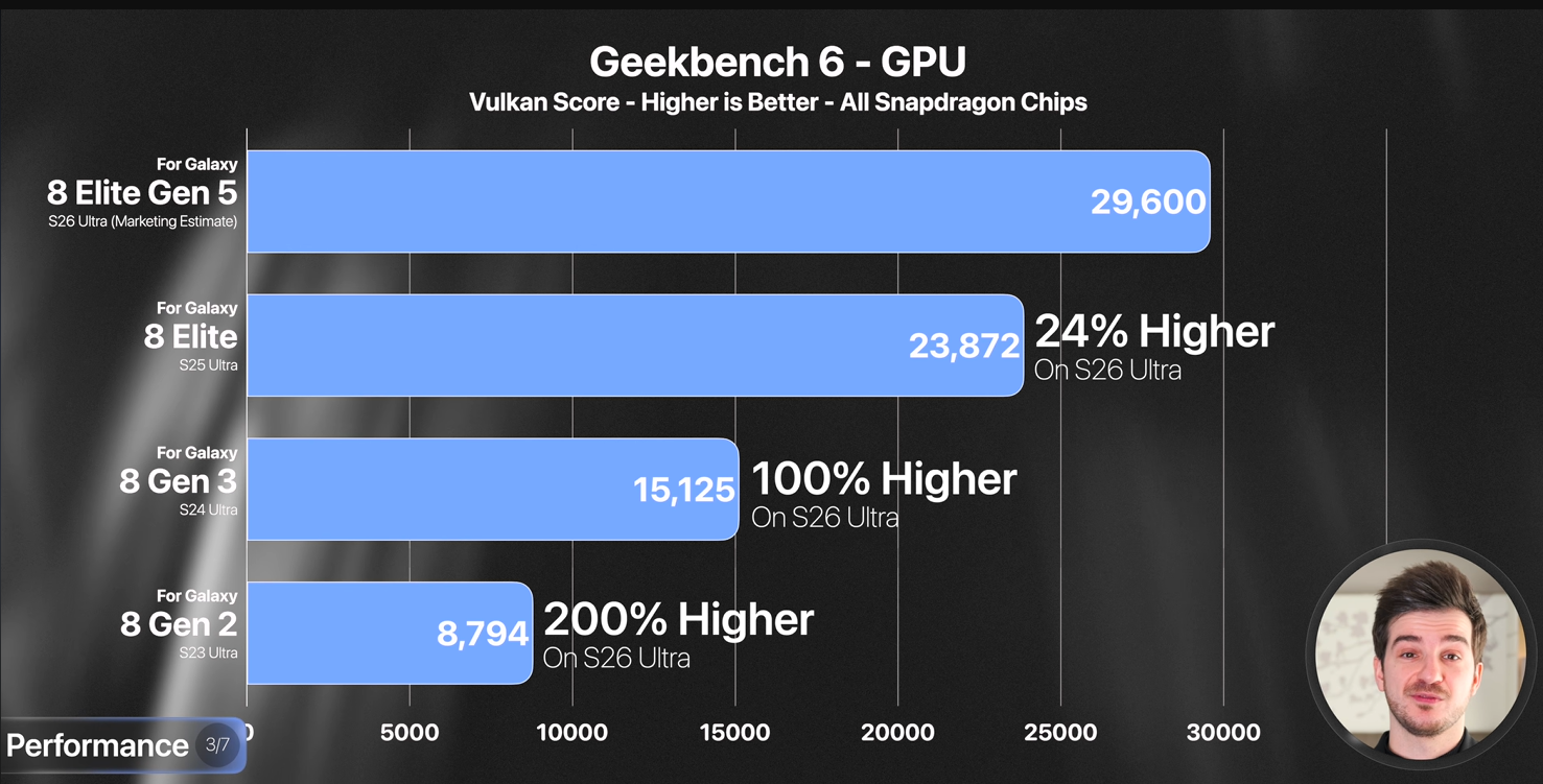 A performance evoluiu de forma constante ao longo das quatro gerações e todas as famílias beneficiaram desses avanços, especialmente após a quebra com o Exynos, na Europa, nos modelos Ultra e que terminou no Galaxy S22 Ultra. Isto torna-se especialmente visível em métricas calculadas e apresentadas por criadores de conteúdo, como o conhecido ZONEofTECH.