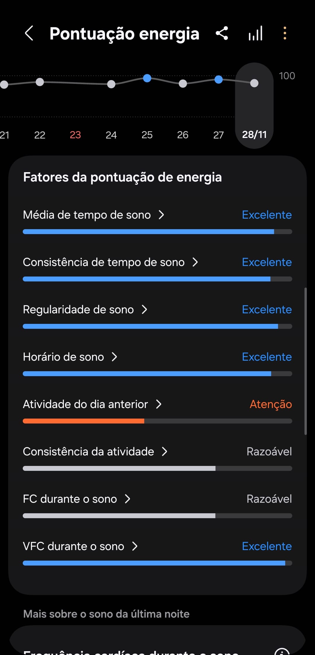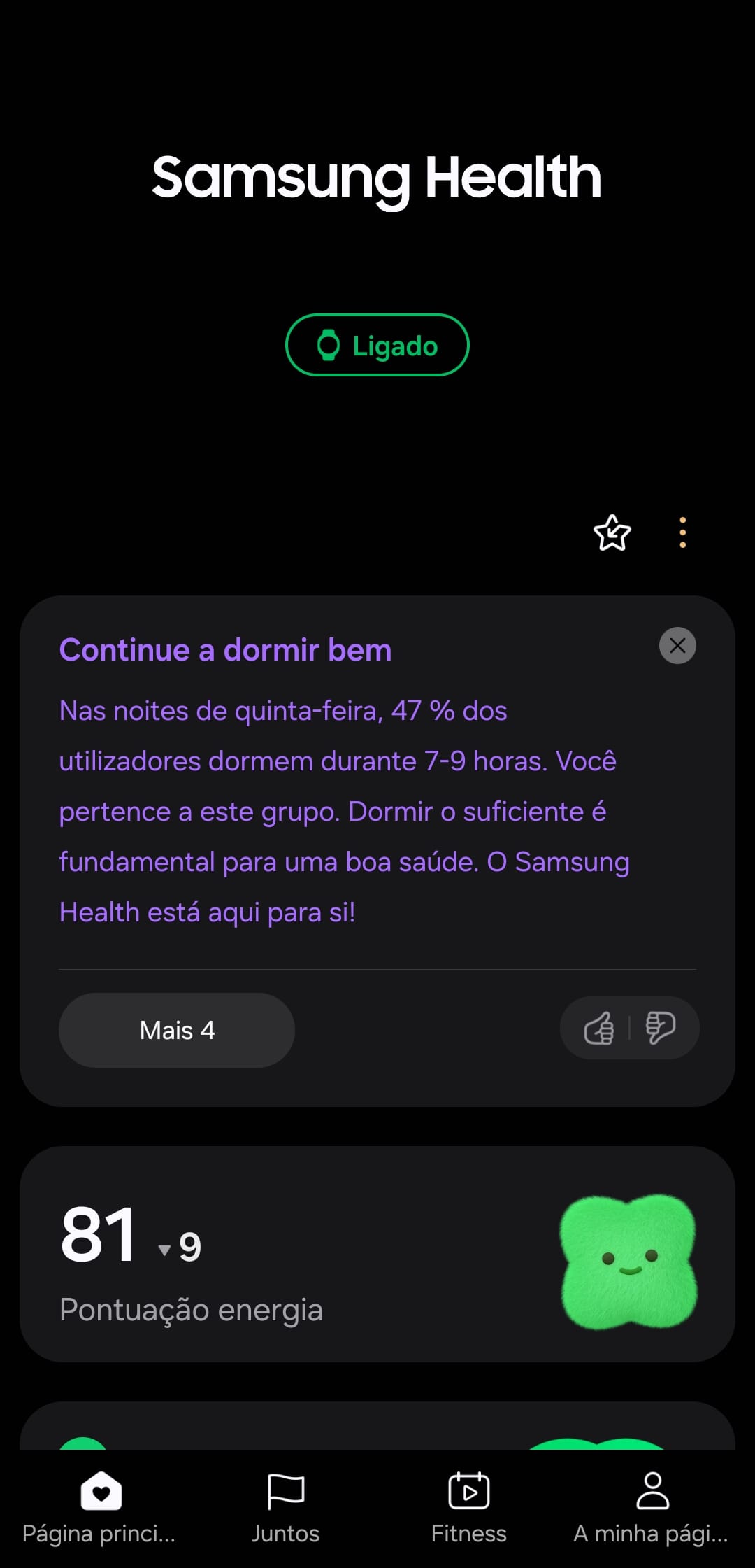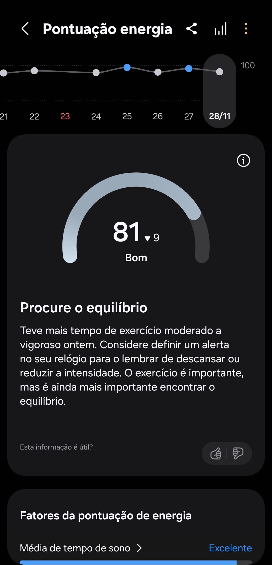 Os Booster Cards acabam por ser interessantes enquanto pequenas mensagens motivacionais ou comparações com outros utilizadores europeus, mas continuam a faltar-lhes a sinergia e a inteligência que a marca anuncia como objetivo desde 2024. Ainda assim, estão integrados na aplicação, o que reforça a necessidade de um widget que permita uma visualização mais rápida, evitando que este seja um recurso totalmente dependente da vontade do utilizador em abrir a app. A pontuação de energia acaba por ser a funcionalidade mais imediata e proativa, já que representa uma métrica baseada no dia anterior e agrega diferentes fatores que influenciam os valores. Mantêm-se os relatórios de sono, programas de melhoria, deteção de ressonar e sugestões para a melhor hora de dormir.