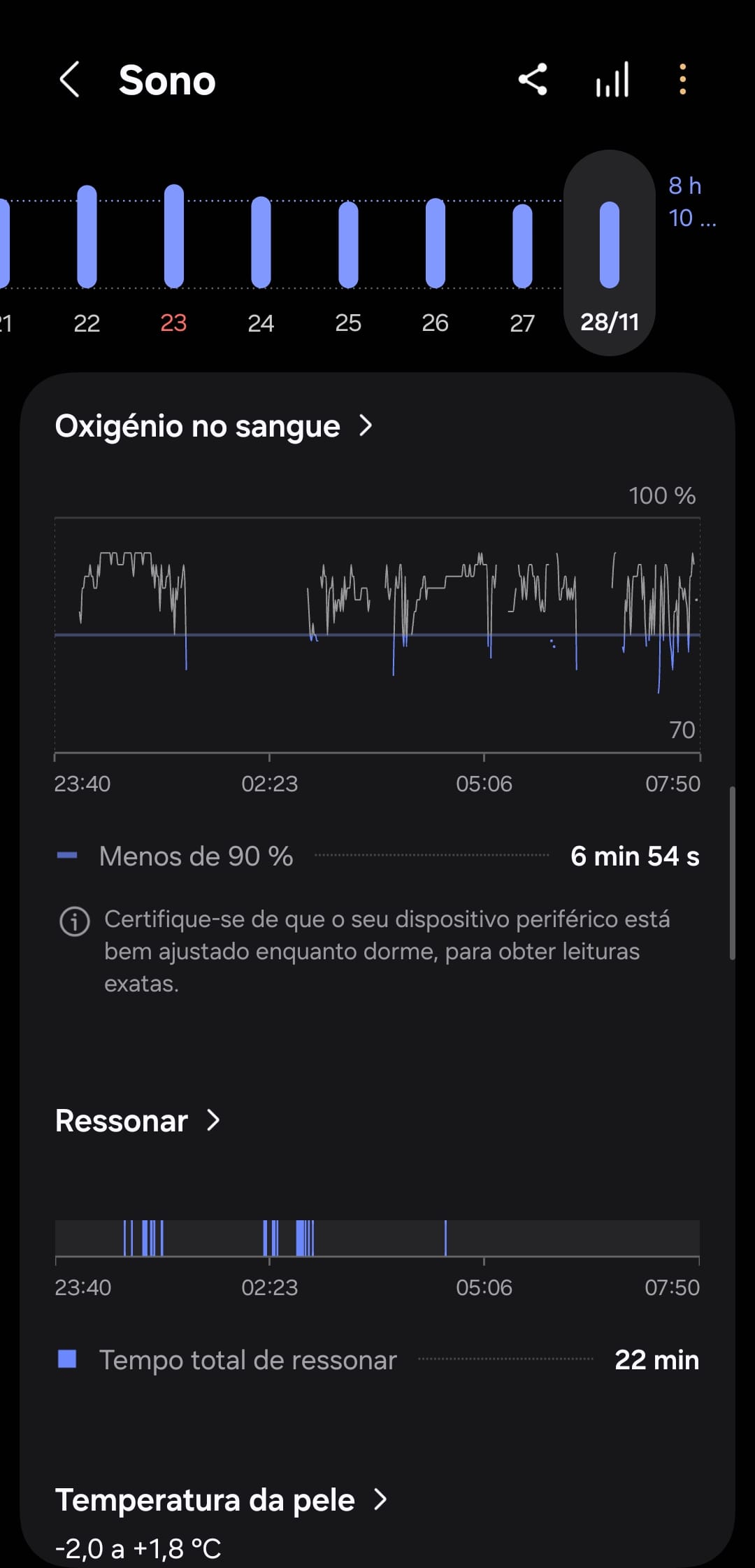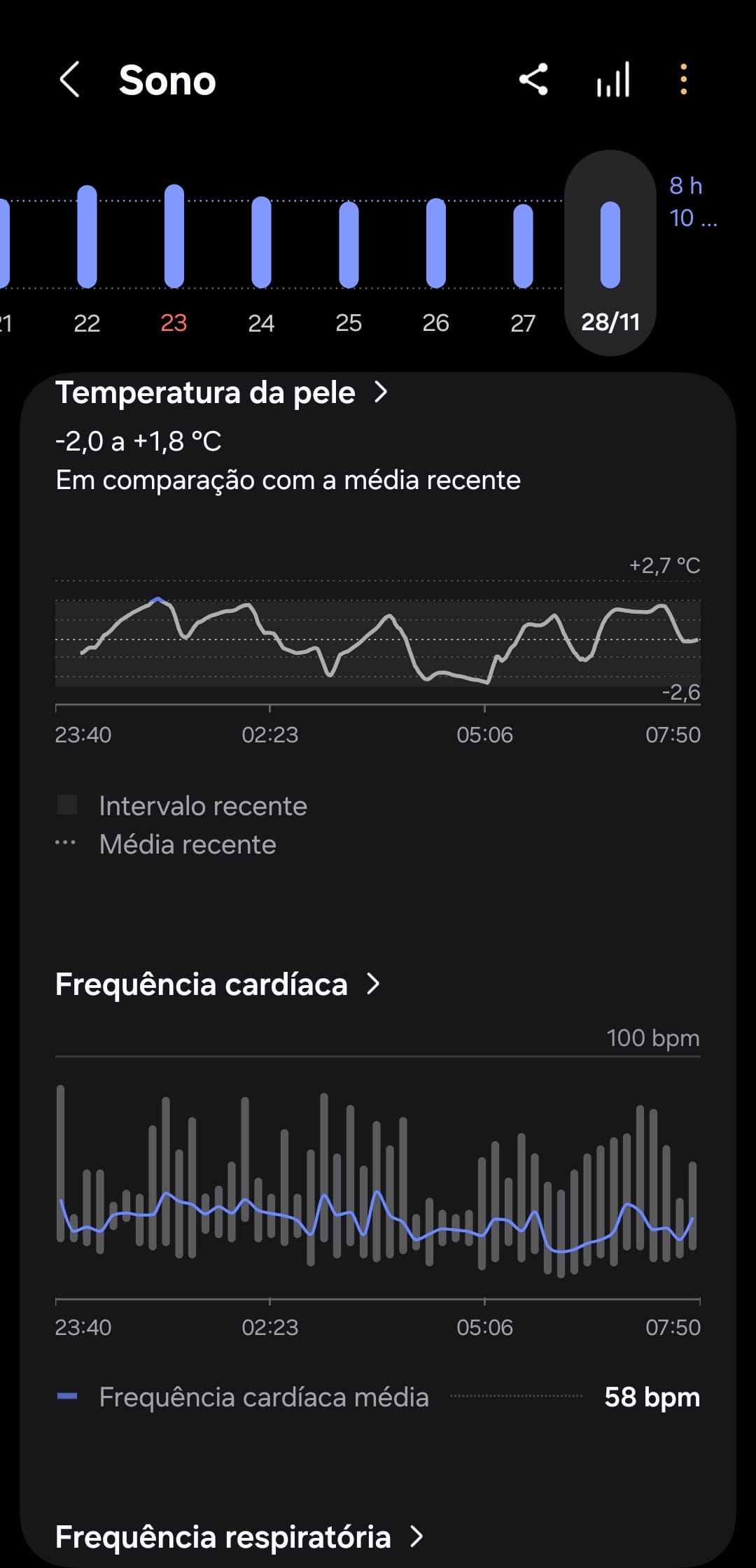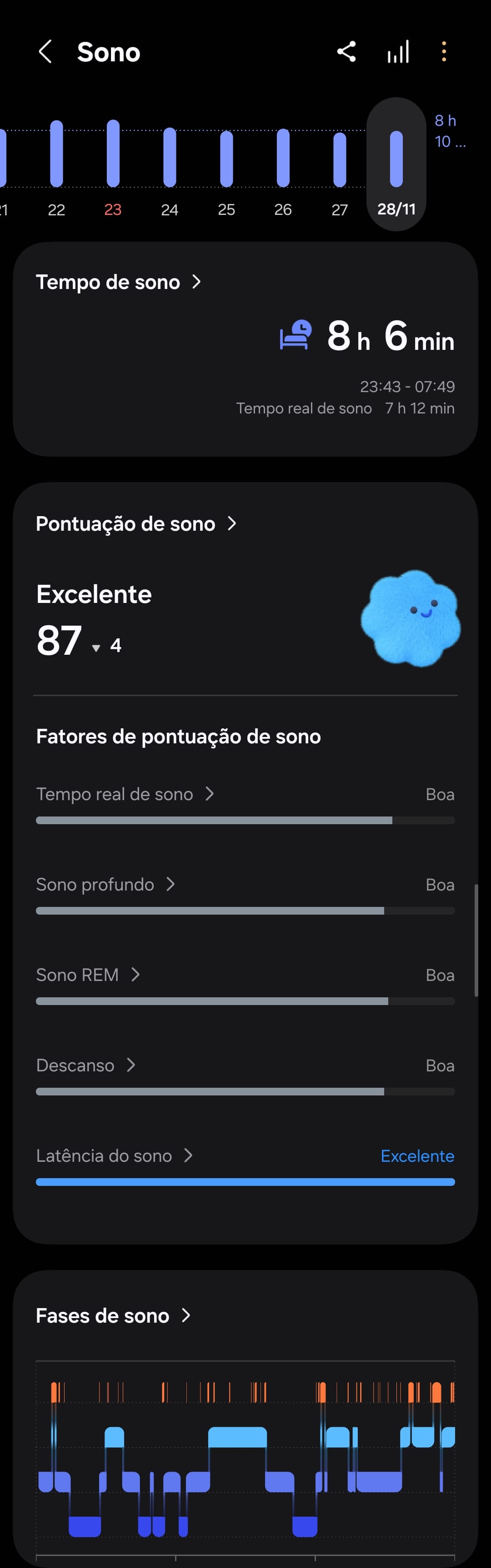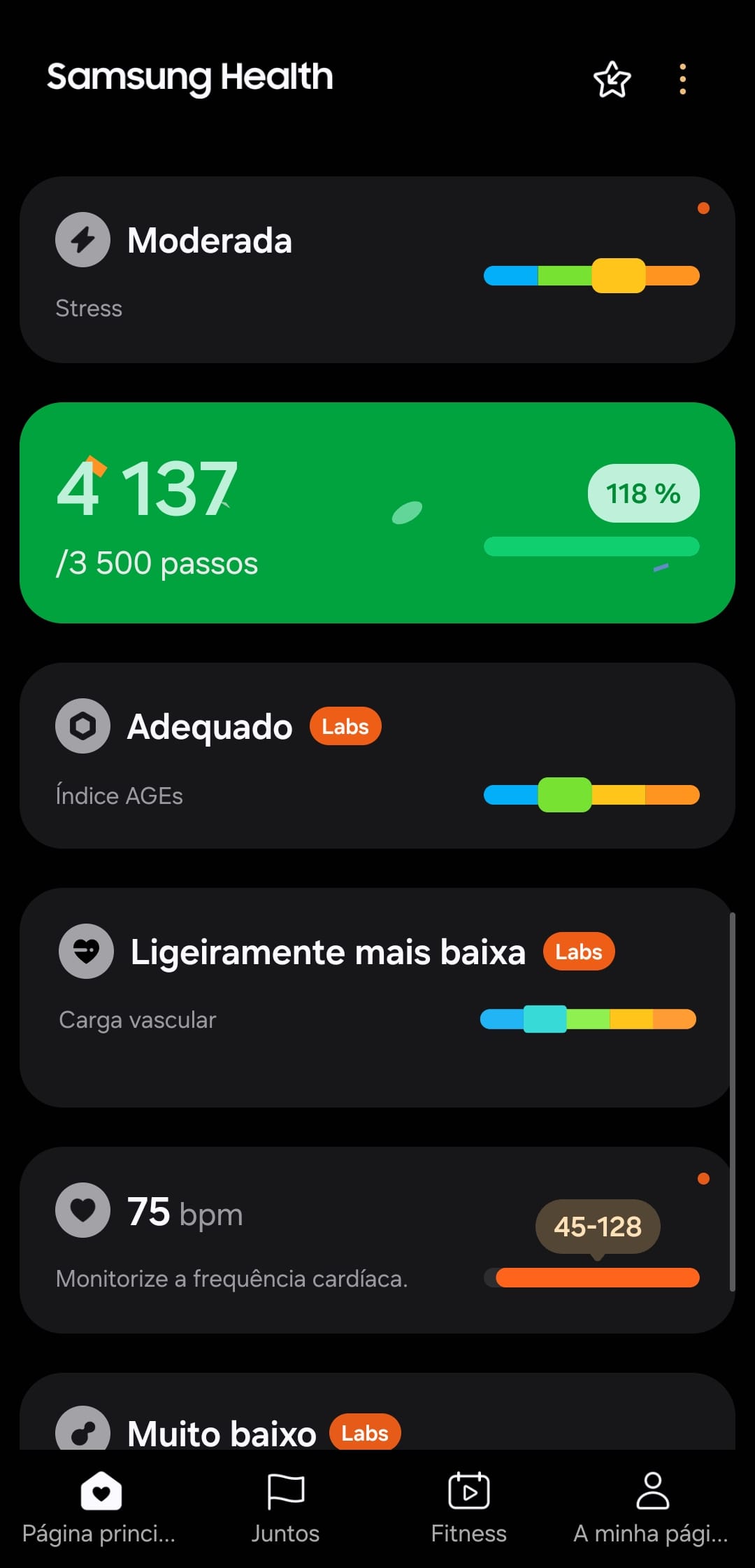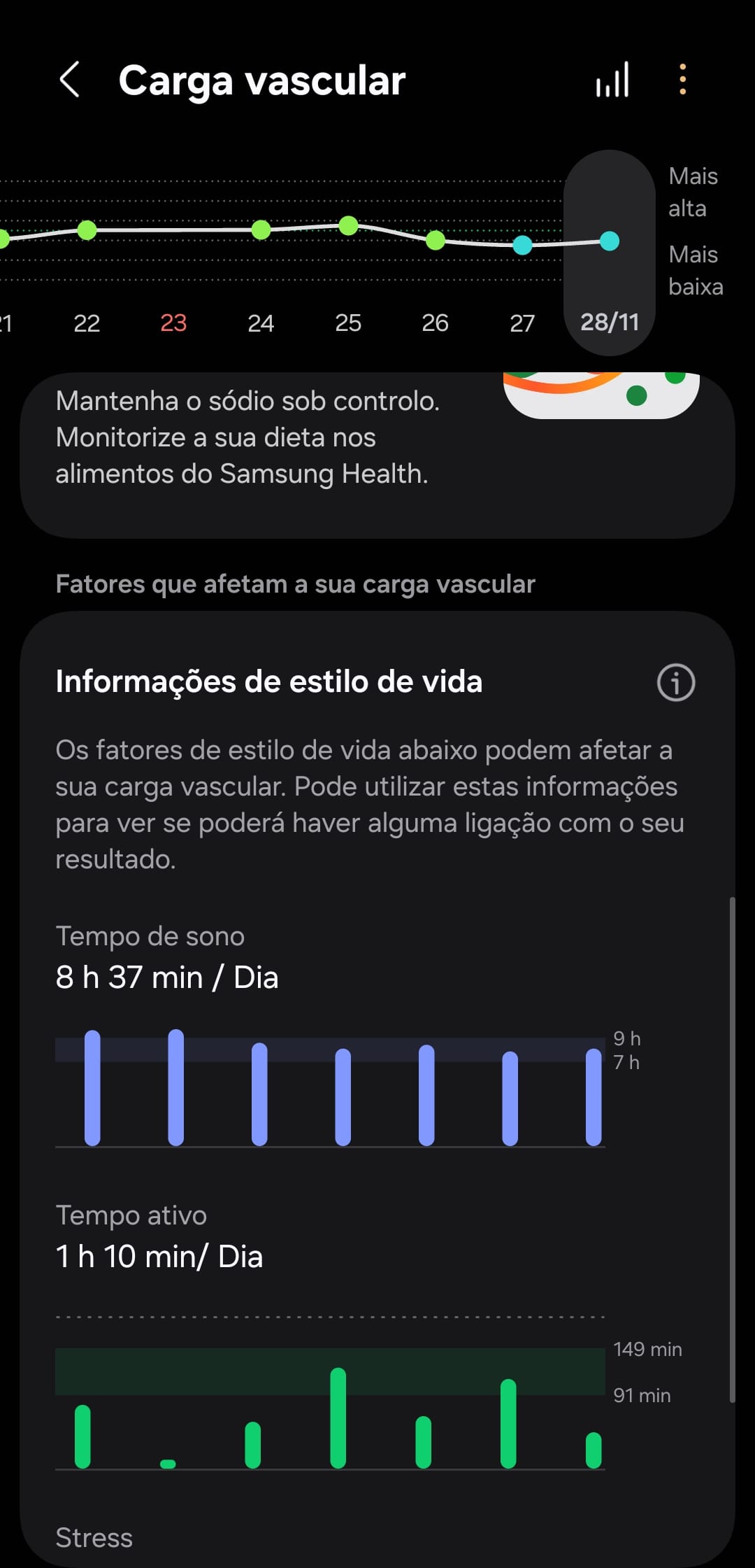 Já a Carga Vascular revelou-se bastante útil, permitindo perceber quase em tempo real de que forma o sono, a atividade diária e o stress impactam o corpo. Ainda assim, sinto falta de proatividade por parte da funcionalidade e, consequentemente, do Samsung Health e do próprio relógio. Não existe qualquer alerta, contexto ou interpretação automática dos dados, nem sequer nos cartões informativos da app, e estas métricas acabam por ficar escondidas, obrigando o utilizador a abrir manualmente cada cartão para obter detalhes adicionais.