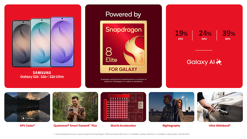 Por fim, o S26 Ultra é complementado por uma câmara frontal de 12 MP (f/2.2) para selfies e vídeo, que nesta geração ganha um campo de visão mais amplo e um novo processamento de imagem.