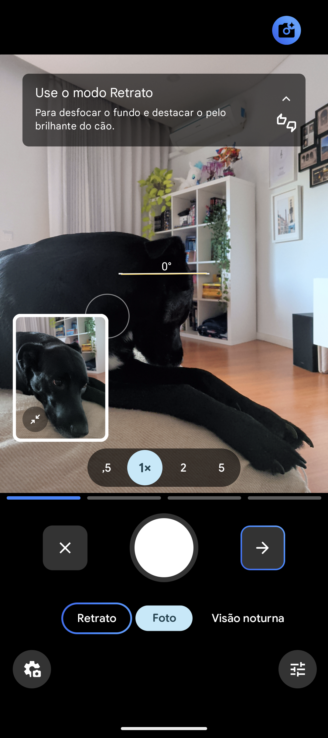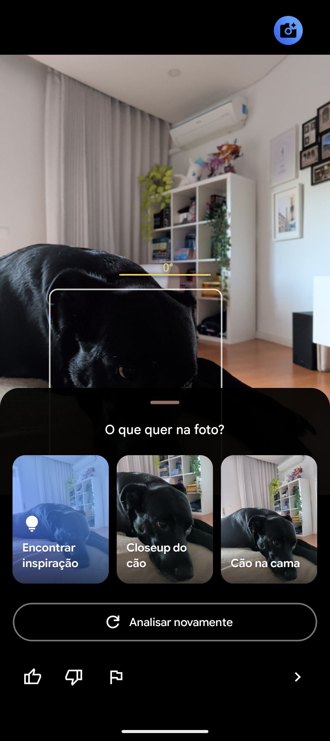 Aqui importa termos o cenário fixo para que, em casos em que capturamos objetos que se movem, como animais, não exista a necessidade de estar a pedir novamente ao nosso assistente para analisar a cena. O certo é que, feito isto, serão apresentadas diversas opções ao utilizador. Como é visível na miniatura, o Assistente simula ainda os cenários nas sugestões que nos dá, o que permite ter quase que uma antevisão de como a fotografia vai ficar. Desta vez, quis escolher o Closeup do cão:
